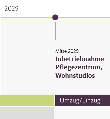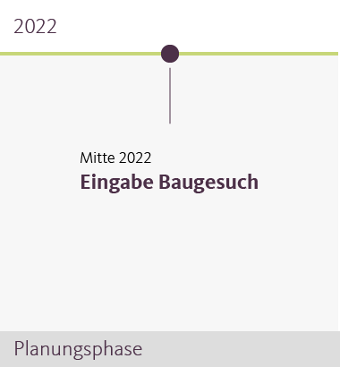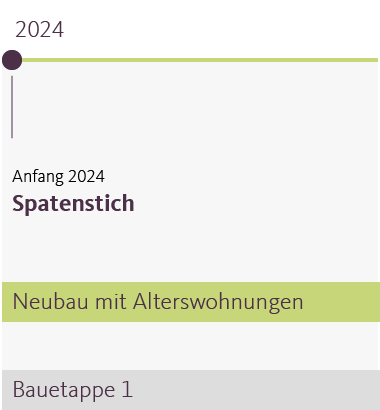Nach Erhalt der Baubewilligung im Dezember 2022 hat unser Projektteam im Januar 2024 den Spatenstich gesetzt. Damit haben wir den Baustart der ersten Etappe markiert. Die Bewohnerinnen und Bewohner können voraussichtlich im Jahr 2026 in die Wohnungen im Neubau umziehen.