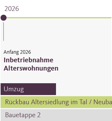 In einer ersten Etappe wird neben der bestehenden Alterssiedlung im Tal im Bereich der heutigen Tennisanlage ein Gebäude mit 60 Alterswohnungen realisiert. Es entstehen 2-, 2.5- und 3.5-Zimmerwohnungen sowie Gemeinschaftsräume.
